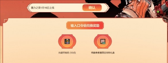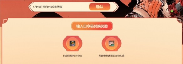 3、輸入重力之泉1月16日上線將獲得50點(diǎn)抗疲勞秘藥,輸入1月16日開啟115全新等級獲得像素寵物禮盒。