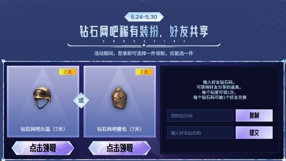 玩家們可以在鉆石網(wǎng)吧稀有裝扮,好友共享這里輸入就可以了。