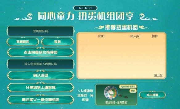 6、6月30日前輸入團隊碼加團可以獲得扭蛋機會,扭蛋進行抽獎獲得隨機獎勵。