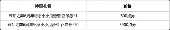 ●額外掉落免費券/半價券:玩家每次進行召喚都有概率額外獲得【云頂之弈6周年紀念小小貝蕾亞召喚 免費召喚券*1】或【云頂之弈6周年紀念小小貝蕾亞召喚 半價召喚券*1】。