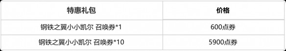 ●特惠召喚:活動期間,玩家可付費解鎖鋼鐵之翼小小凱爾召喚券禮包(每個禮包單Q單大區限購1次),內容及價格如下: