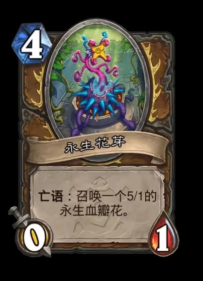4費0/1,亡語:召喚一個5/1的永生血瓣花。