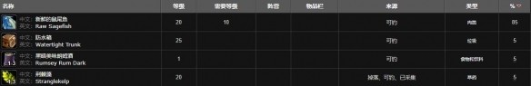 包含:新鮮的鼠尾魚、防水箱、黑暗美味朗姆酒、荊棘藻