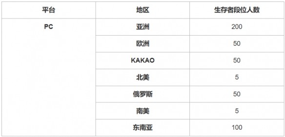 各地區的生存者段位人數限制請見下方表格,該數值今后可能會根據匹配池的實際情況而變化。