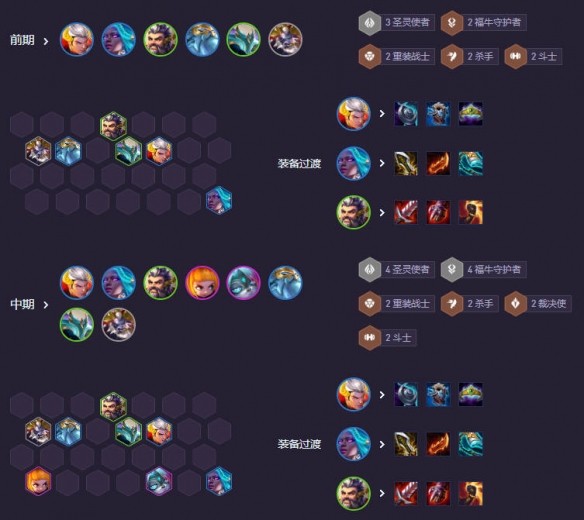 前期有兩星老牛可以升4人口,搭配2福牛2斗士羈絆過渡。質(zhì)量低就擺爛拿裝備,等6人口D牌即可。
