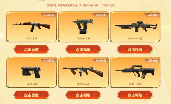 1、活動期間內,玩家們每天登錄游戲就可以領取一件本源系列武器,總共可以領取6個。