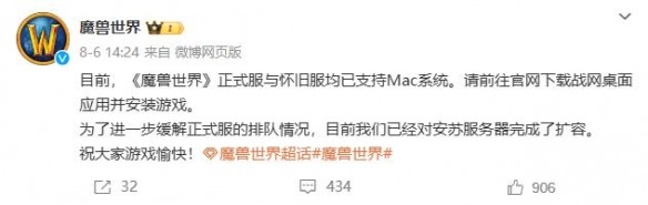 魔獸世界8月6號更新公告:正式服與懷舊服均已支持Mac系統1、2024年8月6日魔獸世界官方已正式宣布正式服與懷舊服均已支持Mac系統;