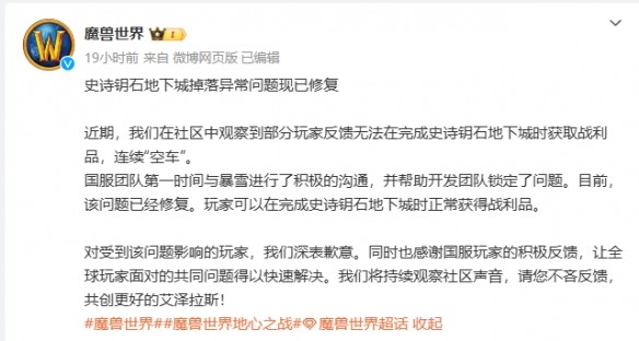 3、目前魔獸世界和暴雪已經幫助開發團隊鎖定了問題,已經修復了史詩鑰匙的地下城的掉落問題。