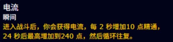 3、奔騰電流:戰斗開始時獲得電流狀態,每2秒疊加10精通,持續24秒最高240點,隨后緩慢衰減并循環。