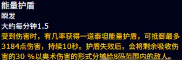 6、能量護盾:受到傷害時觸發一個可吸收3184點傷害的護盾,持續10秒,結束后將未吸收部分的30%以秘法傷害反彈至8碼范圍敵人。