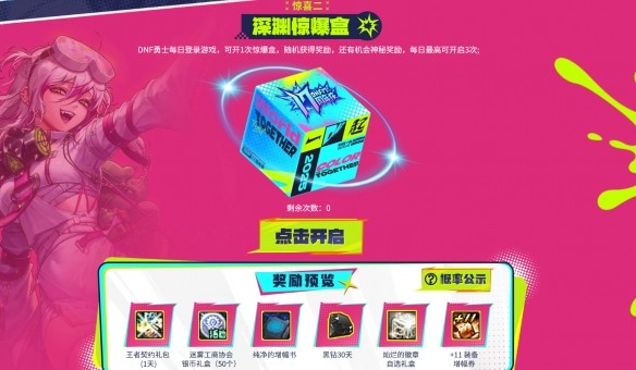 2、每天登錄游戲可獲得【驚爆盒】,打開能獲得隨機獎勵,每天最多開三次;