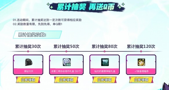 4、抽獎1次可得1積分,累積抽獎30/50/80/120次可獲得階段禮物;