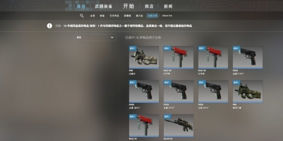 10個(gè)材料合成1個(gè)高一階的飾品,若材料來(lái)自不同武器箱,隨機(jī)選擇其中一個(gè)箱系的上級(jí)(概率與材料數(shù)量相關(guān))。