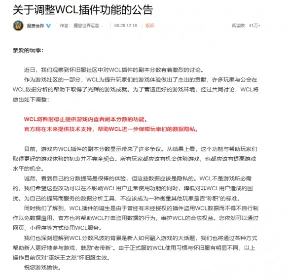 懷舊服WCL插件調整了什么答:暫時關閉了WCL插件的查看副本分數的功能。