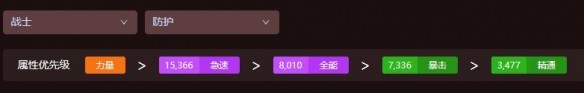 力量永遠是防戰的第一選擇,隨后武器的優先級選擇急速,可以增加自己嘲諷和防御的效率,副屬性為全能,玩家在選擇裝備時盡可能選擇急速和全能加成較高的裝備。