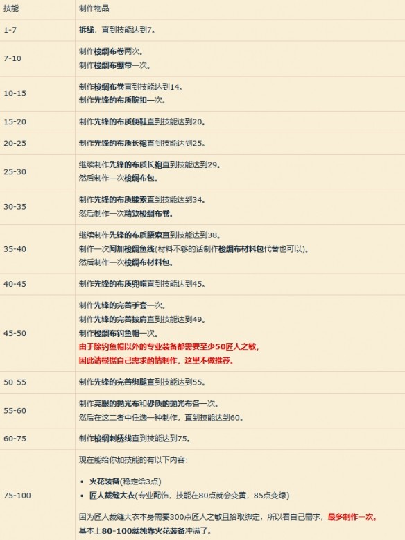 45-50:制作先鋒的完善手套一次,制作先鋒的完善披肩直到技能達到49,制作梭綢布釣魚帽一次。(由于除釣魚帽以外的專業裝備都需要至少50匠人之敏,因此請根據自己需求酌情制作,這里不做推薦)
