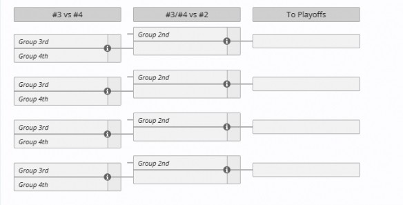 2、接著第三名和第四名的勝者和小組中的第二進行單敗淘汰賽,勝者晉級到8強的淘汰賽,敗者淘汰。