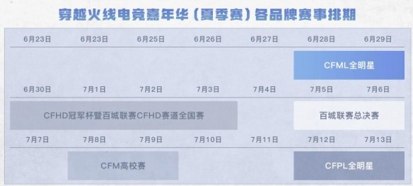 3、其中百城聯(lián)賽在7月5日-7月6日舉行。CFPL全明星在7月12日-7月13日舉行。
