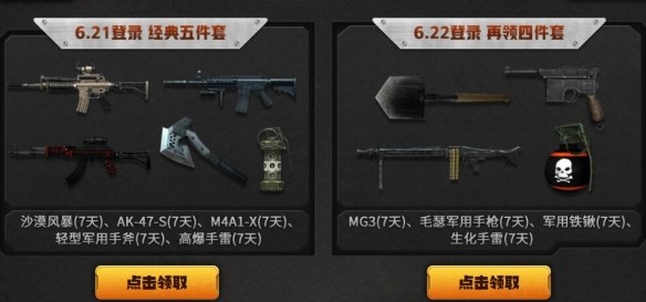 3、6.23-6.27登錄補領沙漠風暴(7天)、毛瑟軍用手槍(7天)、輕型軍用手斧(7天)。