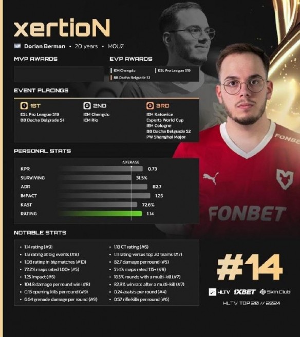 hltv2024選手top20總覽是怎樣的?俄羅斯新秀donk以統治級表現榮膺榜首,m0NESY和ZywOo分列二、三名,評選綜合了選手全年賽事數據、MVP/EVP榮譽及大賽淘汰賽表現,接下來就讓為大家帶來CS2選手TOP20榜單一覽。