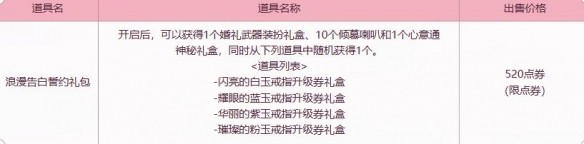 1、活動期間將上架浪漫告白誓約禮包,售價520點券,開啟后可獲得婚禮武器裝扮等獎勵;