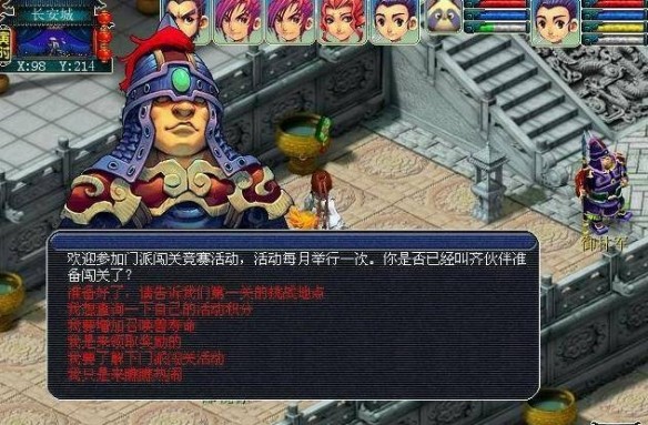 1、門(mén)派闖關(guān):會(huì)在每個(gè)月第一個(gè)周日15:00—17:00進(jìn)行,去長(zhǎng)安皇宮門(mén)口找門(mén)派闖關(guān)使領(lǐng)任務(wù)。