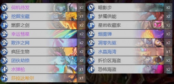 2、思路偏極限快攻,反復回手凋零先驅、三個(5/5的)折價區海盜以及新增的燃薪之劍+恐怖海盜都是準時打出就贏一半的combo,缺點是完全沒續航。