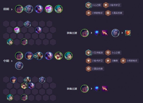 前期優先拿奎桑提天選,心之鋼奎桑提天選搭配:奎桑提、莉莉婭、塞納、厄斐琉斯。6人口開4秘術或5鋼。秘衛奎桑提天選:前期開4秘術,后排可以用飛機+卡莎,飛機帶裝備打工,或者用巴德+娜美,娜美帶裝備打工。最優解是用塞納+厄斐琉斯,6人口可以開3鋼,過度有強度而且經濟更高。嫖卡質量高可以直接用奎桑提過度到8人口再換天選,過度質量低可以在6人口換鐵男天選,后排可以不動。前中期站位技巧:用塞納飛機站中間位置,技能可以命中更多對手。我放前排浪人站位,避免對手塞納或AOE打到更多前排。