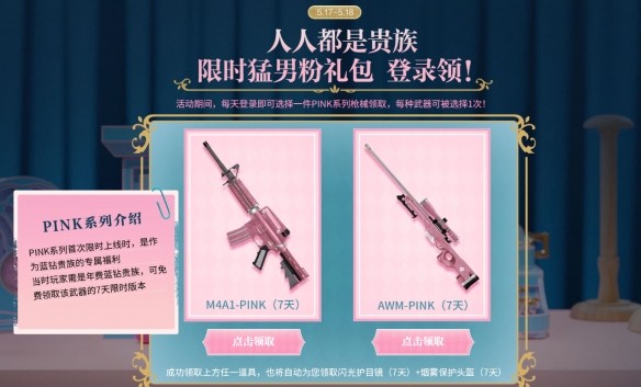 1、活動期間每天登錄即可選擇一件PINK系列槍械領(lǐng)取。